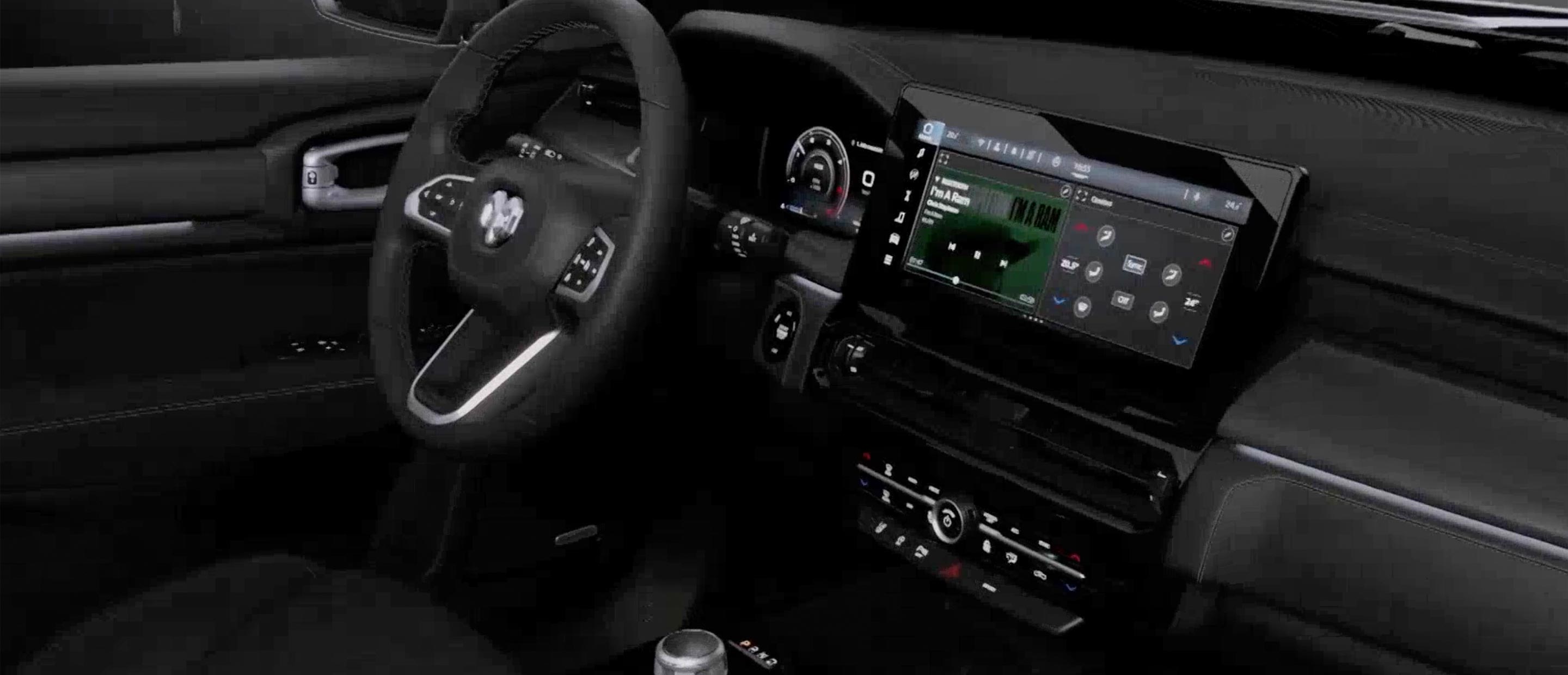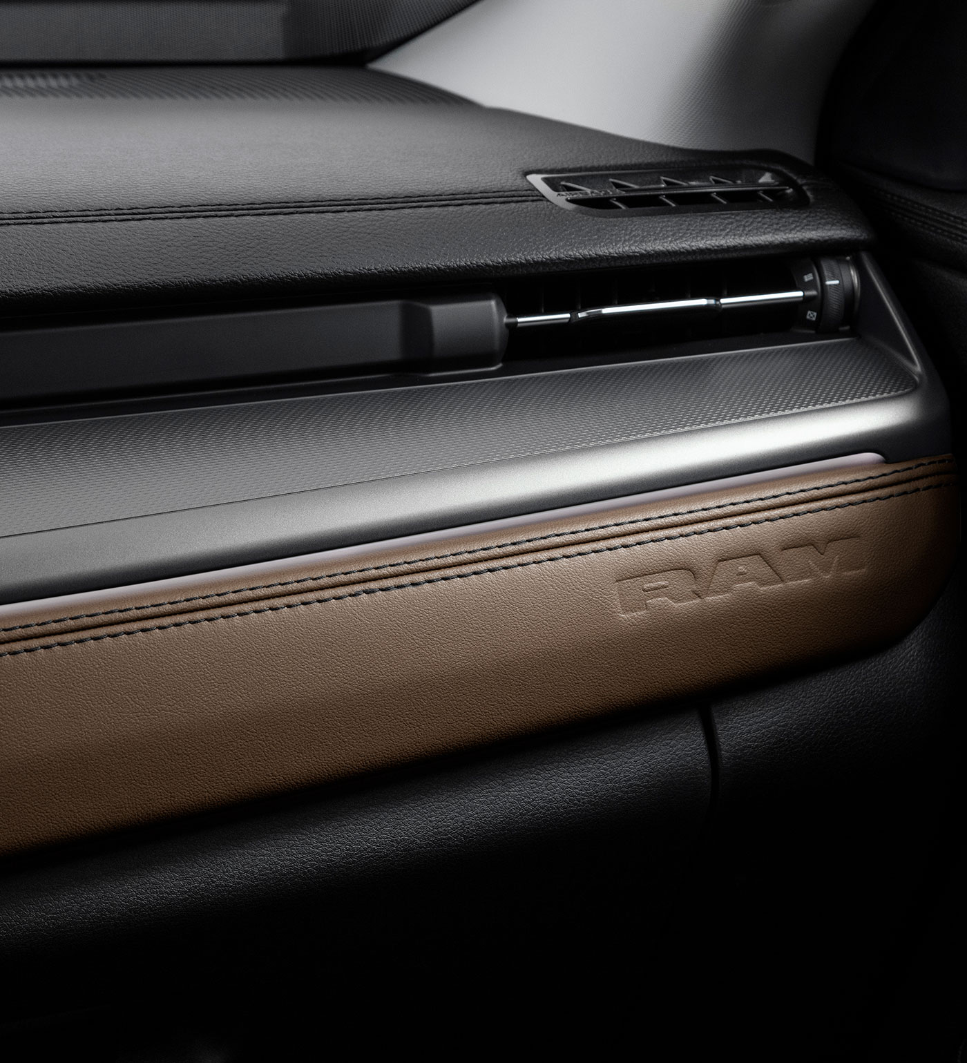 Independientemente de la versión, el interior de la Rampage es muy refinado. Presenta materiales suaves al tacto y opciones elegantes, como el sofisticado tono Mountain Brown o una lujosa combinación de cuero y gamuza en la versión Laramie.
